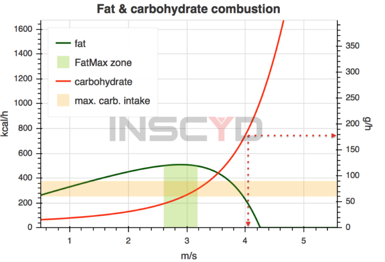 But how did Spindler really predicted the result so precisely using INSCYD? He firstly points out that he used a mixed approach: he firstly looked at what Xamena had run in the past in terms of % of anaerobic threshold and validate this finding with the fat and carbohydrate combustion chart on INSCYD.