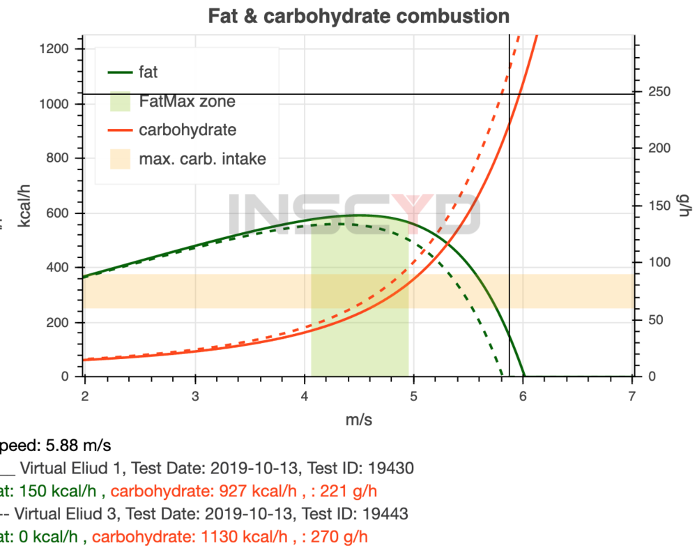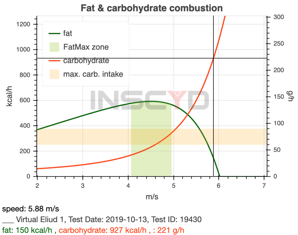 The key to this high utilization is the low capacity of his glycolytic system (VLamax). A relatively weak glycolytic systems means that the organism can rely primarily on fatty acids as a fuel at a moderate speed. Significant carbohydrate combustion rates are shifted to higher speed, closer to VO2max. In our case here, at a speed of 5.88 m/s the carbohydrate combustion rate is 221 g/h. As described above, the maximum possible carbohydrate combustion rate was 240g/h without “bonking”.